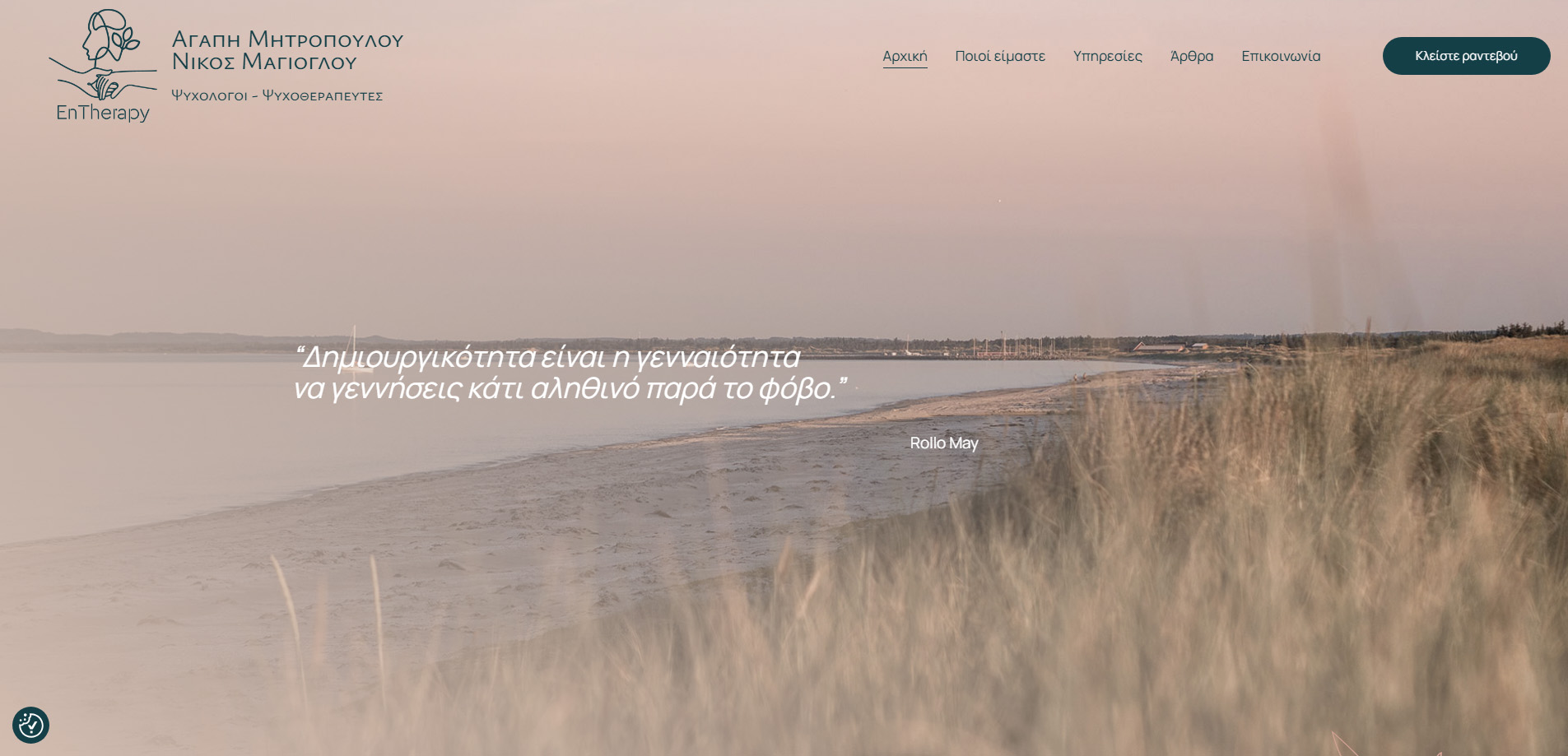 H En Therapy μάς ανέθεσε τον σχεδιασμό της νέας της ιστοσελίδας, με στόχο να αποτυπωθεί η μοναδική της προσέγγιση στην ψυχολογική υποστήριξη και θεραπεία. Δημιουργήσαμε μία σύγχρονη και φιλική πλατφόρμα που αντανακλά την ανθρωποκεντρική φιλοσοφία της Entherapy, προσφέροντας στους επισκέπτες μία ζεστή και ασφαλή εμπειρία πλοήγησης.
