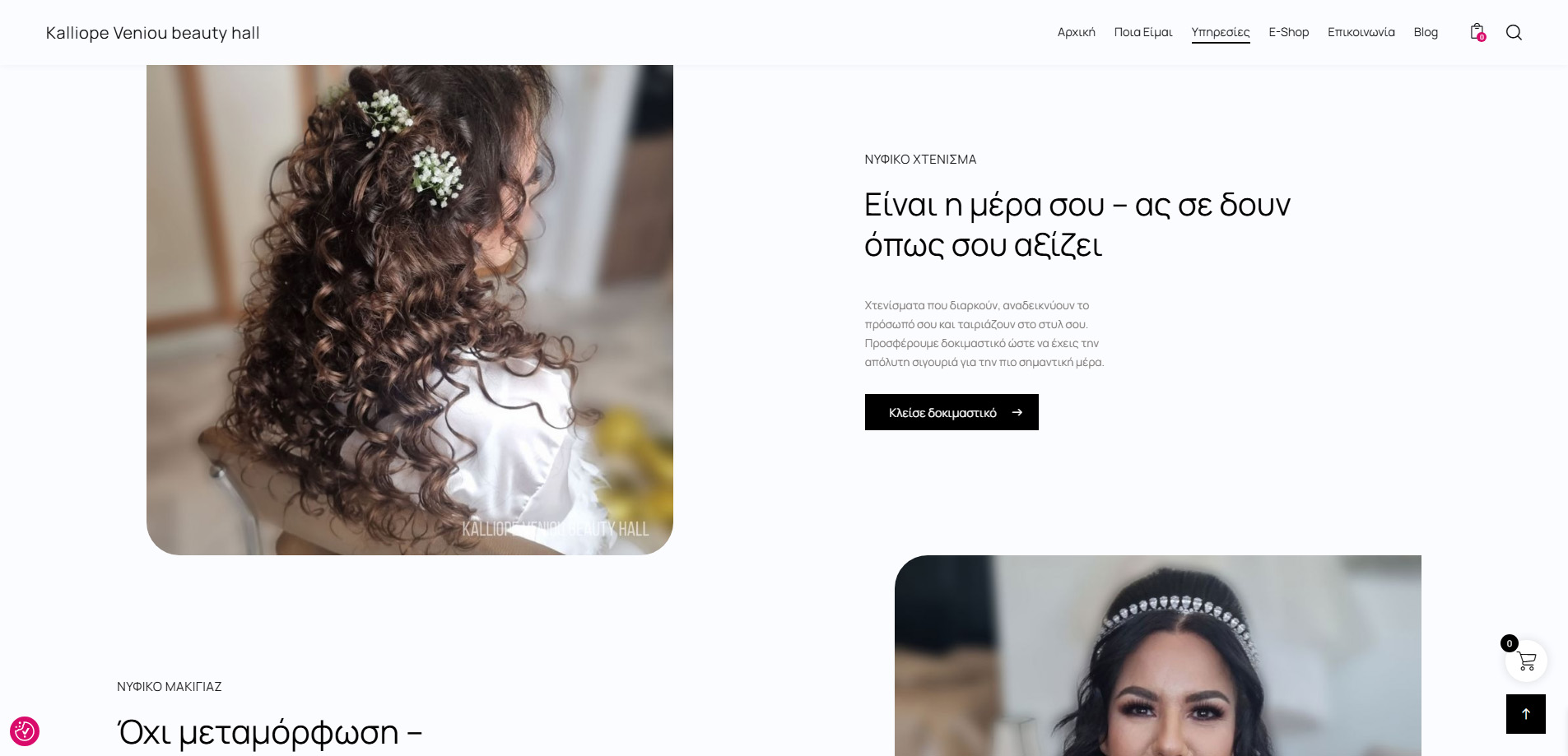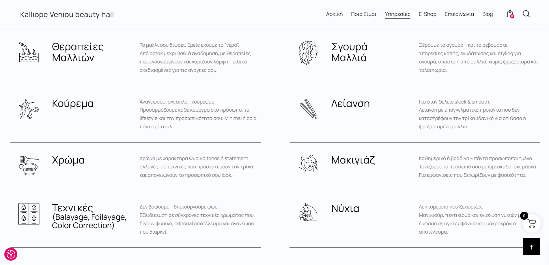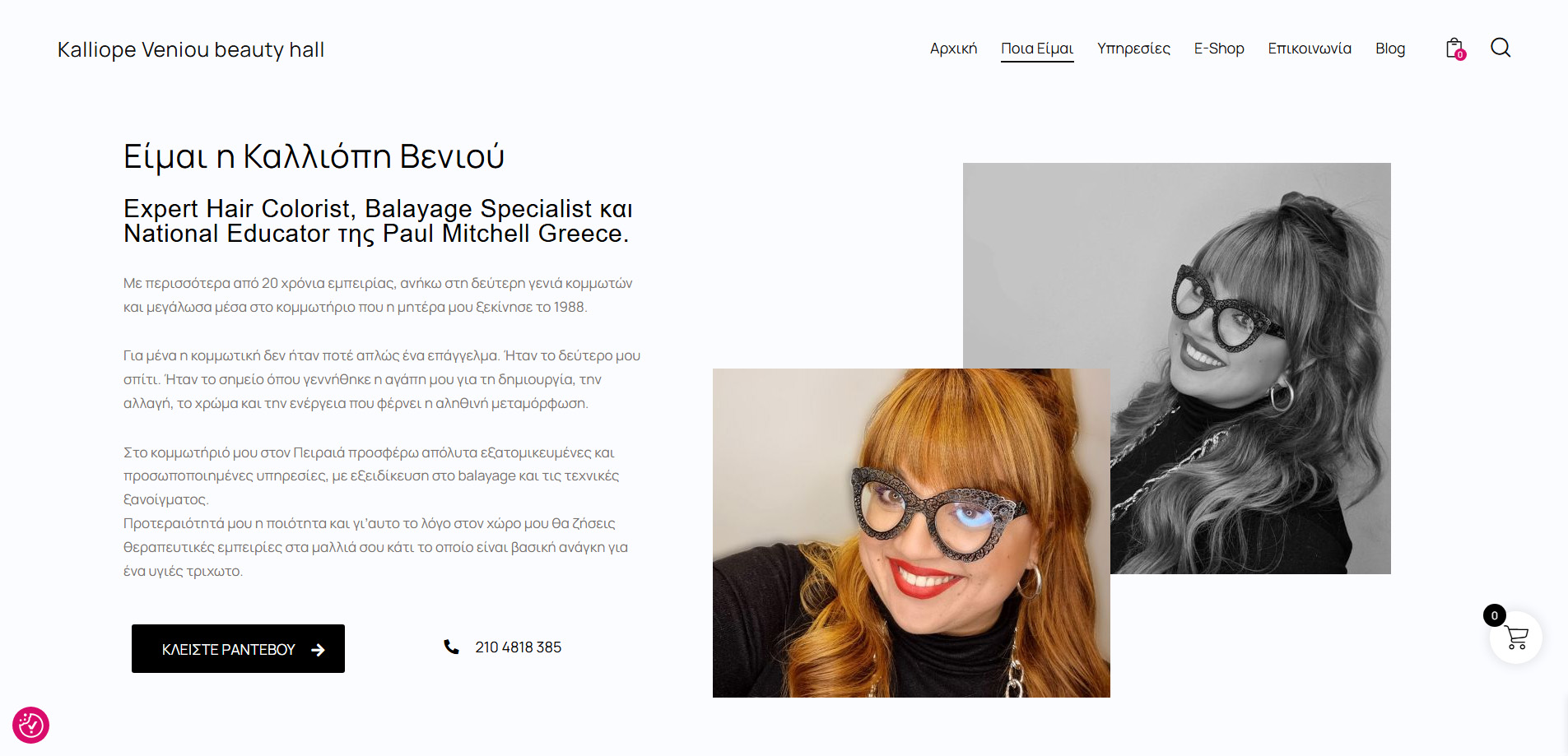 Η νέα ιστοσελίδα παρουσιάζει με απλότητα και καθαρότητα τις υπηρεσίες της Καλιοπής, όπως κουρέματα, χτενίσματα και θεραπείες μαλλιών, ενώ ενισχύει την ψηφιακή παρουσία της με εύκολες επιλογές για online ραντεβού και άμεση επικοινωνία με την ίδια. Με έμφαση στην αισθητική, τη λειτουργικότητα και την εξαιρετική εμπειρία χρήστη σε όλες τις συσκευές, η ιστοσελίδα καθιστά το Kalliope Veniou Beauty Hall τον απόλυτο προορισμό για όποιον επιθυμεί να ανανεώσει το στυλ και την εμφάνισή του με επαγγελματισμό και δημιουργικότητα.